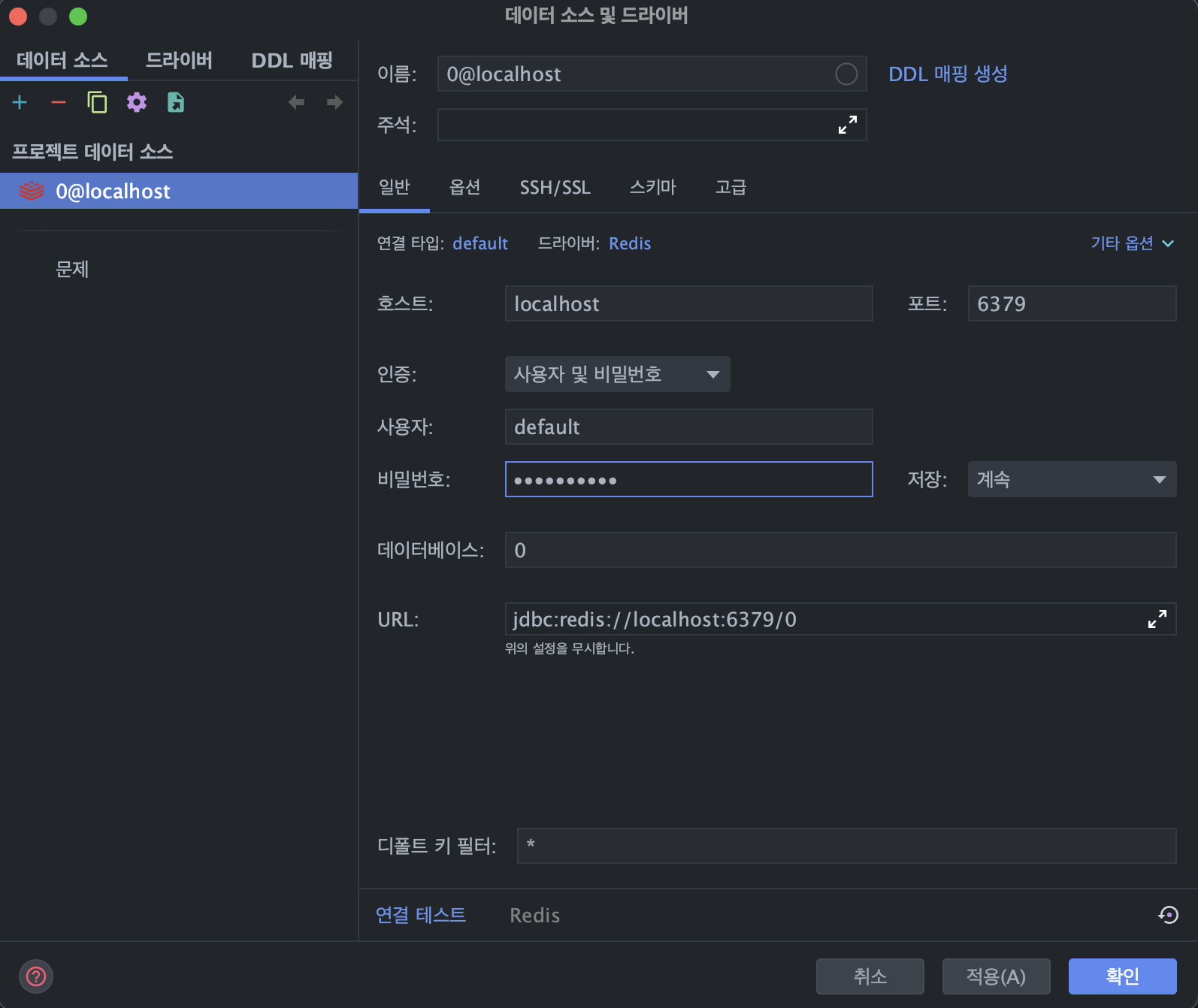 2️⃣ 자신의 Redis 인스턴스의 Host와 Port(위의 과정을 따랏다면 localhost, 6379)를, 이후 User는 default, Password는 로컬에 설치한 경우 생략, Docker로 설치한 경우 자신이 password에 넣은 값을 넣어줍니다.