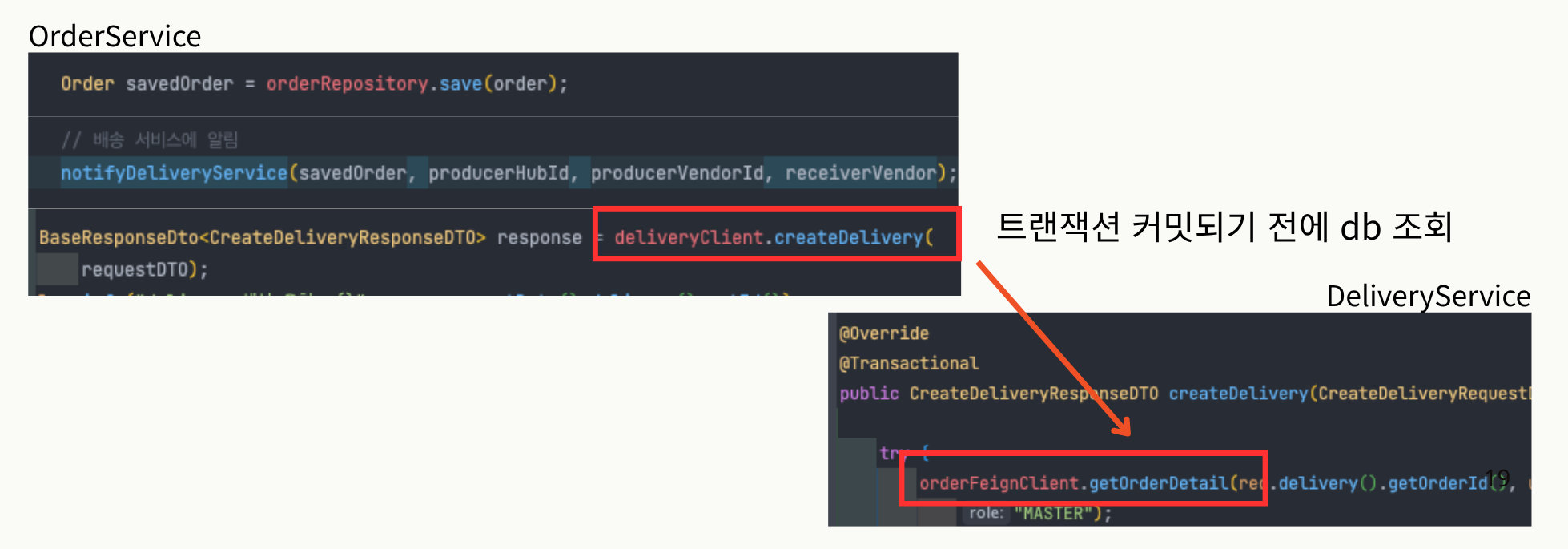 커밋 지연 : Order Service의 트랜잭션이 아직 커밋되지 않아, Delivery Service가 Order Service의 DB를 조회할 때 (Order Service의 getOrder호출 시) Dirty Read를 허용하지 않는다면해당 주문을 찾지 못한 상황이다.