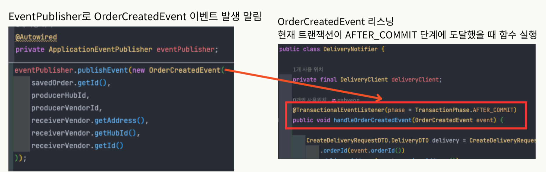 트랜잭션 이벤트 리스너를 사용하면서 OrderCreatedEvent 레코드를 따로 만들었다. 이유는 이벤트 리스너는 호출자 트랜잭션이 커밋된 후에 실행된다. 즉 이벤트 리스너가 실행될 때, createOrder메서드 내의 로컬 변수들 (예:savedOrder객체 자체)은 이미 소멸되었거나Spring 세션 관리 영역에서 벗어났을 수 있다. 따라서 OrderCreatedEvent에 필요한 데이터 (ID, Hub Id, Vendor Id 등) 단순한 값을 복사하여 담아두고, 이벤트 리스너가 실행될 때는 이 복사된 값을 사용하여 전달한다.