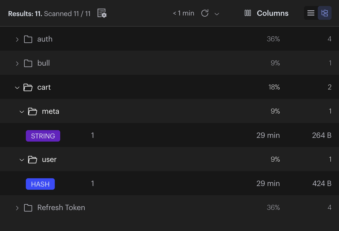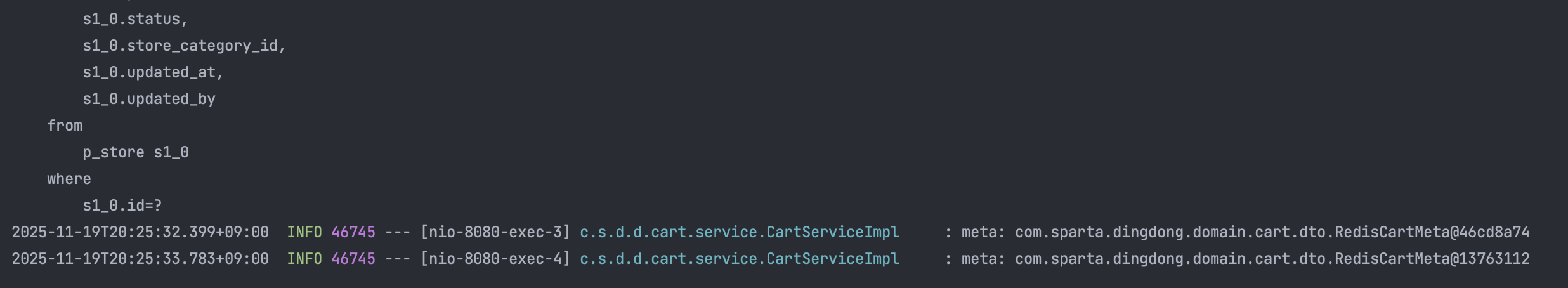 | cart:meta:1 | String | {"storeId": "s1 ...", "storeName": "중국집 만리장성", "cartId": "c1..."} |