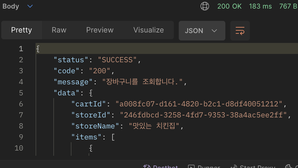 | cart:user:1 | a3f2... (탕수육 ID) | {"menuName": "탕수육", "unitPrice": 20000, "quantity": 1, ...} |