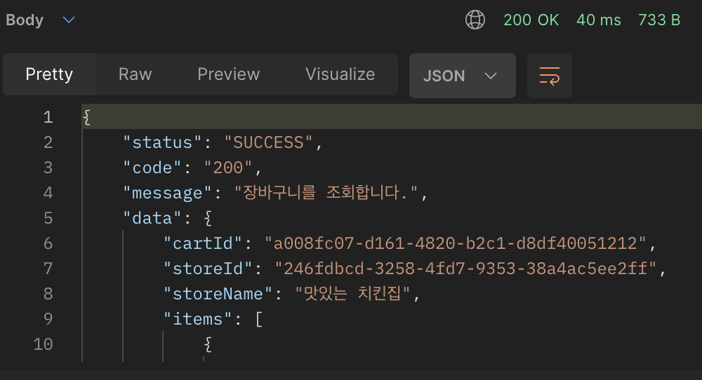| cart:user:1 | e705... (짬뽕 ID) | {"menuName": "짬뽕", "unitPrice": 6000, "quantity": 2, ...} |