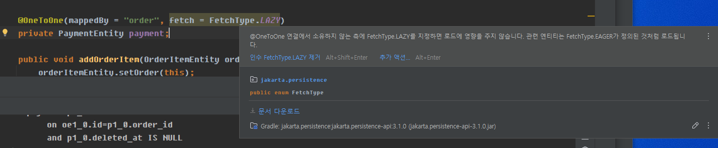 - 즉, 양방향 @OneToOne 에서 mappedBy 속성을 사용한 객체에 fetch.LAZY는 적용되지 않는다.